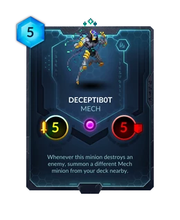 - When Deceptib0t destroys X other minions in a single attack (with Kinematic Projection or Furor Chakram), it will optimally (normally) yield X Mech spawns. There doesn't seem to be a guarantee that it'll summon X other Mechs (because of an unknown bug), but you will at least get 1. Mechs that are not spawned because of this problem stay in your deck.