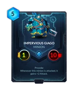 | Impervious Giago | 5 | 1 | 10 | Provoke Whenever this minion is attacked, it gains +2 Attack. | |||