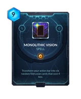 | Monolithic Vision | 9 | Transform your action bar into six random Vetruvian cards that cost 4 less. | |||||