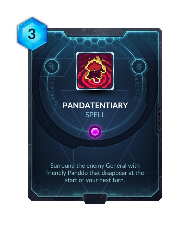 The Panddo created by this card are not actually real Panddo, but a different minion with the same name that disappear at the start of your turn. This ability can be dispelled, but it is not an enchantment. This means that shuffling copies of these Panddo into your deck with Mirrorrim or adding a copy of one to your hand with Second Self does NOT remove the "disappear" ability. This makes a combo with Pandatentiary and Pandamonium to surround the enemy General with permanent Panddo impossible, even though by the card wording it should work. The developers do not consider this "bug" worthy of fixing or even acknowledgement.